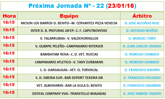 ** Se da por perdido por cinco goles a cero al Inter. D. Benito Pintura Jafep el partido contra el V. Valdehornillos por retirarse del terreno de juego antes de la conclusión del tiempo reglamentario, y además se