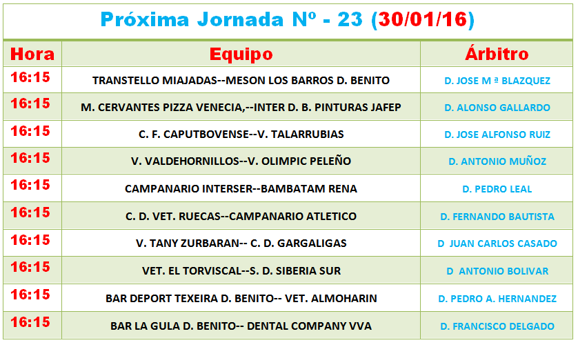 ** Se da por perdido por cinco goles a cero al Inter. D. Benito Pintura Jafep el partido contra el Valdehornillos por incomparecencia y además se le sanciona con las costas completas del arbitraje más 25 € de multa y se le apercibe con la expulsión de la AFAS si no compareciese en otro partido, además se sanciona al árbitro con dos meses sin arbitrar. Por falsear el acta de dicho partido. (Art. 7 apartados a, b, c y d).