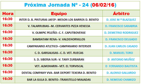 –>Se sanciona con UN partido a D. Ricardo Tapia Bordallo (M. Cervantes Pizza Venecia), a D. Juan Tomas Quiles Zazo (V. Talarrubias), Manuel Delgado Martín (Inter. DB. Pinturas Jafep). Todos por acumulación de amonestaciones.