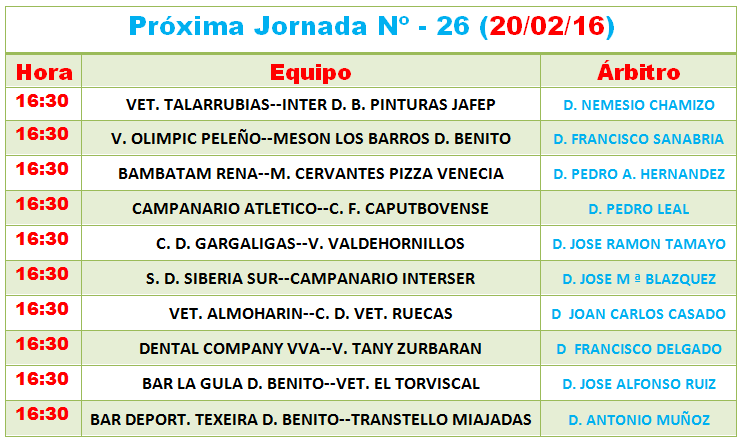 –>Se sanciona con UN partido a D. Francisco Rodríguez Serrano (V. El Torviscal), a D. Francisco José Morcillo Parejo y D. José Antonio Cerrato Sauceda (Inter. DB. Pinturas J.), a D. José Andrés Cabanillas Madrid y D. Manuel Llerena Sánchez (S. D. Siberia Sur) a D. José Maria Escudero Trabado (V. Ruecas) y a D. Francisco José Guerra Carroza (Bambatam Rena). Todos por acumulación de amonestaciones.