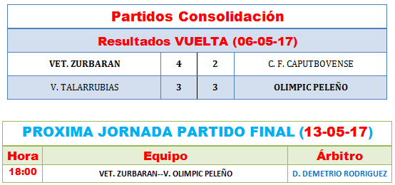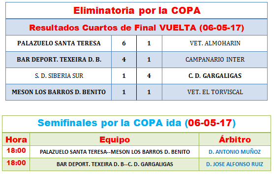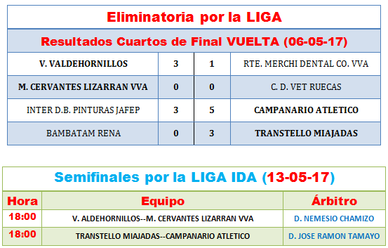 SEMIFINALES, JUGARAN POR LA LIGA (GANADOR DEL BAMBATAM RENA- TRANSTELLO MIAJADAS, CONTRA GANADOR DEL INTER D. BENITO PINTURAS JAFEP – CAMPANARIO ATLETICO) Y GANADOR DEL (M. CERVANTES LIZARRAN – C. D. VET. RUECAS, CONTRA EL GANDOR DEL V. VALDEHORNILLOS – RTE. MERCHI DENTAL VVA.) SEMIFINALES JUGARAN POR LA COPA (GANADOR DEL PALAZUELO SANTA TERESA –VET. ALMOHARIN, CONTRA EL GANADOR DEL MESON LOS BARROS D. BENITO- VET. EL