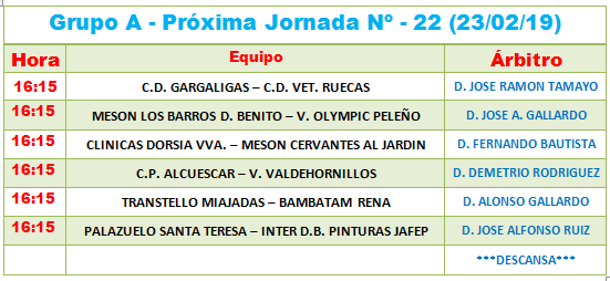 Se sanciona con UN partido a D. Luis Manuel Carrasco Díaz del Transtello Miajadas, a D. Felipe Porras Donoso del V. Gargáligas, a D. David Calvo Redondo del Campanario Inter. Equus, a D. Gabriel Santos Márquez del Mesón los Barros D. Benito, a D. Antonio Manuel Fuentes Ruiz del Vet. Ruecas y a D. Raúl Vitar González del Inter. D. Benito P. Jafep. Todos por acumulación de amonestaciones.