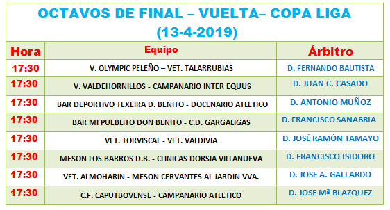 A continuación se muestran los partidos que se jugarán en la Copa de la Liga y Copa de Consolación. Para cualquier duda o pregunta pueden realizar un comentario en el apartado de “Preguntas y Sugerencias».