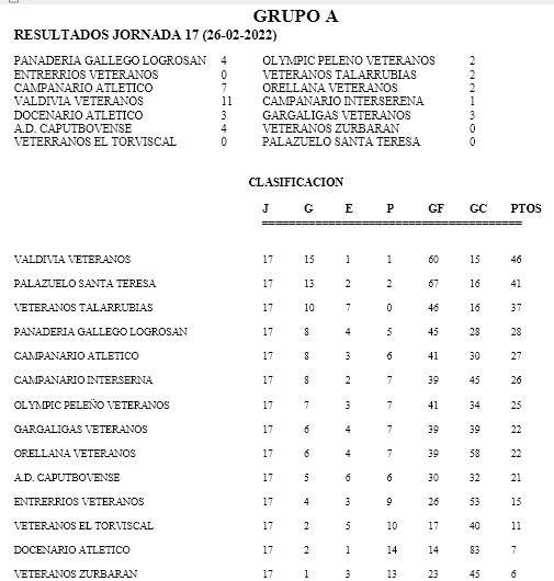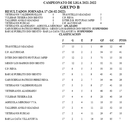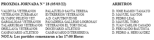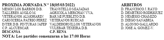 ** El partido CARNICERIAS PATRICIO PEREZ RENA – MESON LOS BARROS que se suspendió en el minuto 5 de la primera al quedarse el Mesón Los Barros. con 6 jugadores se da por finalizado por 5-0 por el artículo 7.F del reglamento de competición.