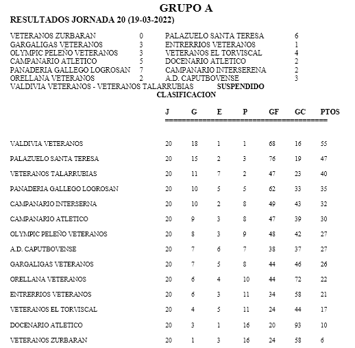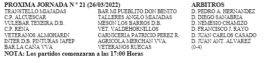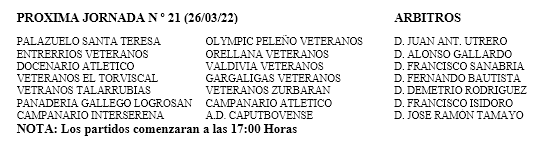Se sanciona al equipo Veteranos Talarrubias, con la pérdida de su partido con el equipo Valdivia Veteranos por 5-0 por incomparecencia. Además por el artículo 7.C de los estatutos debe abonar la totalidad del recibo arbitral (60 euros), más 50 euros de multa, en el plazo máximo de 15 días, de no hacerlo así como indica el apartado 7.D, no se designará árbitro para sus partidos, perdiendo todos los que debiera jugar. Se recuerda que 2 incomparecencias en una misma temporada, así como indica el apartado 7.G de los estatutos supone la expulsión inmediata de la AFAS.